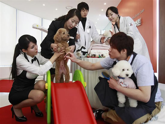 特殊服務也層出不窮:針灸、中醫草本治療、美甲、可以讓小狗看起來像熊貓的皮毛染色、狗狗和主人一起做的瑜伽(“狗瑜伽”),等等。